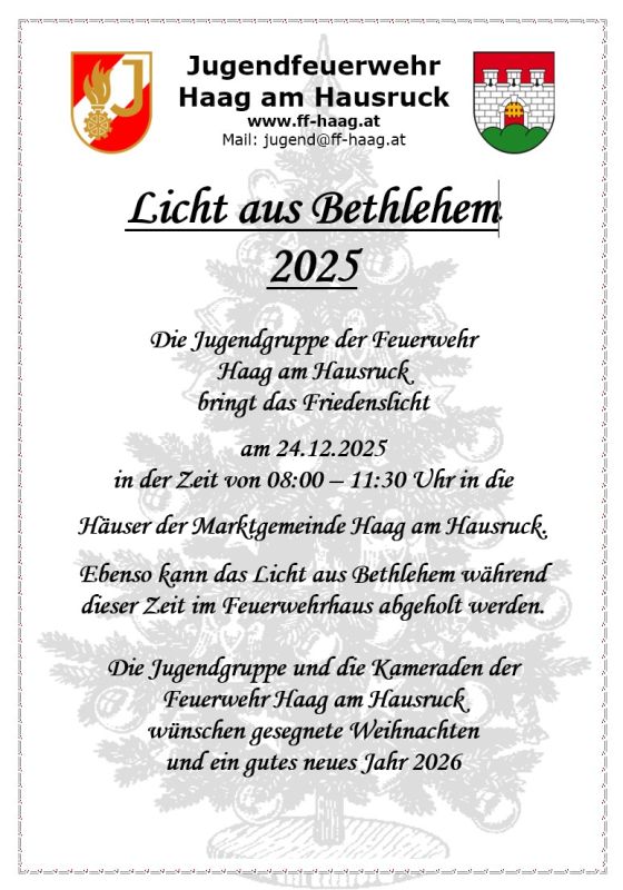 Die Jugendgruppe der Haager Feuerwehr bringt am 24. Dezember 2025 wieder das Licht aus Betlehem in die Häuser unserer Marktgemeinde.