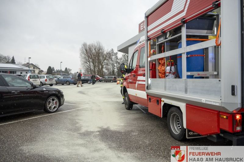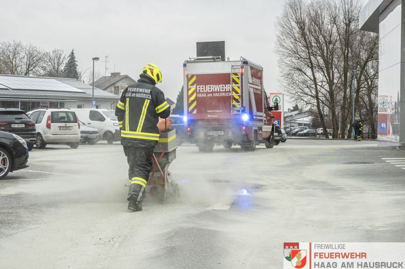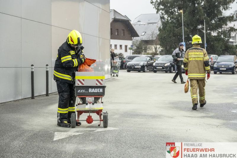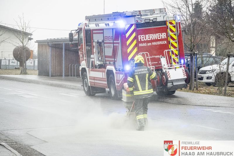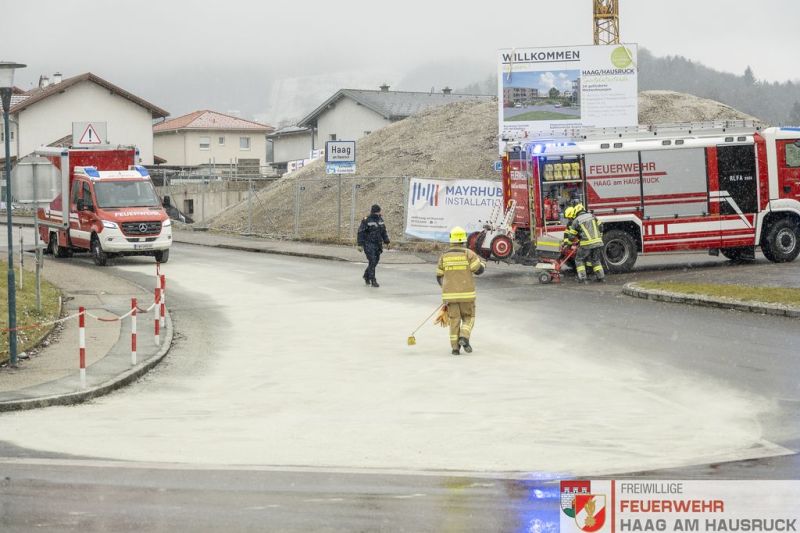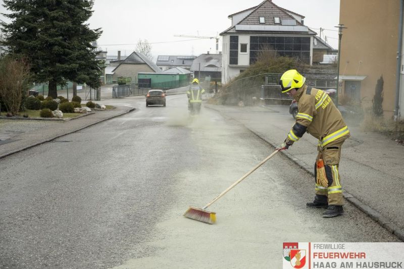 Wir streuten den Bereich von der Lambacherstraße bis zur Sportplatzstraße, eine Länge von nahezu einem Kilometer, mit mehreren Säcken Ölbindemittel ab. Der Verursacher ist uns unbekannt, die Polizei ermittelt.
